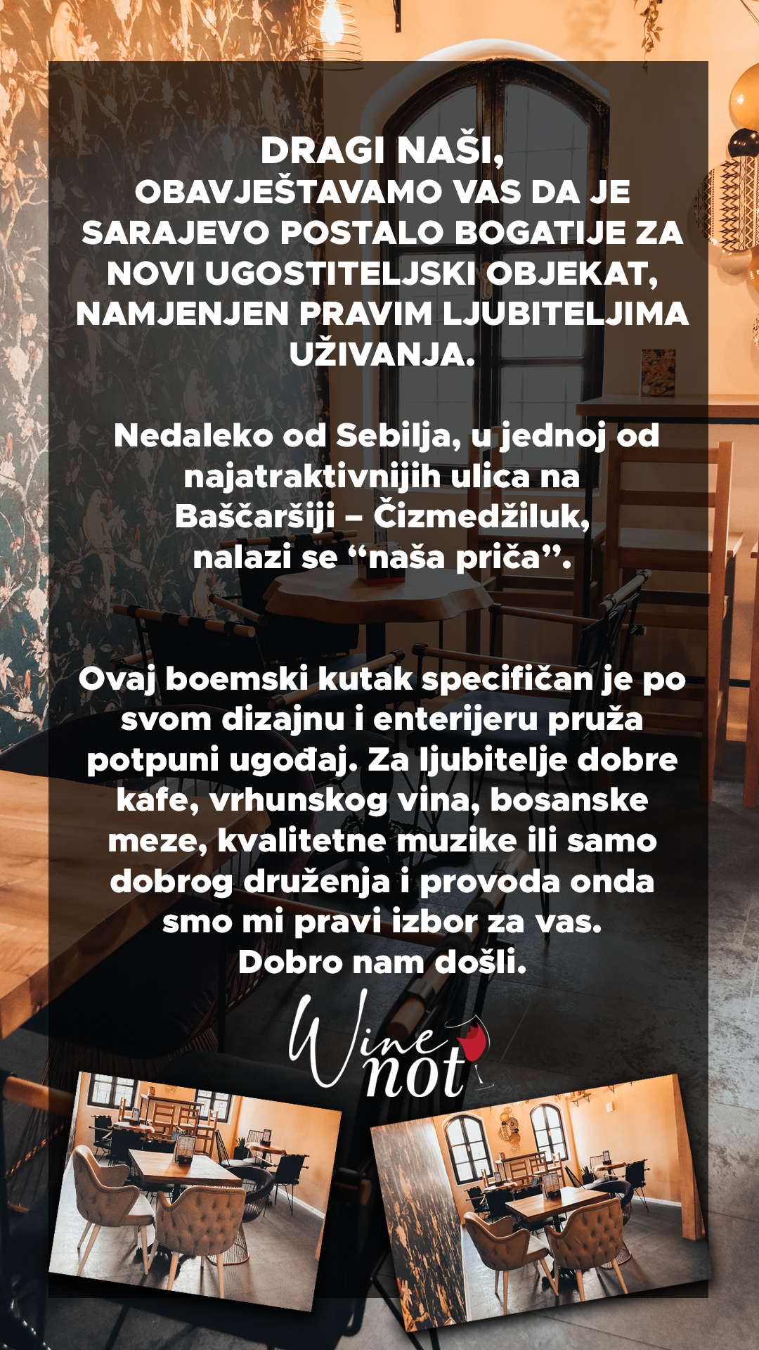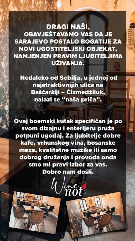Wine Not je šarmantni kafić posvećen ljubiteljima vina. Nudimo sofisticiranu atmosferu u kojoj možete uživati u pažljivo odabranim vinima iz različitih područja. Naša ponuda uključuje bogat asortiman vinskih sorti, prateće uzorke te ugodno mjesto za opuštanje i dijeljenje trenutaka s prijateljima. Dođite i istražite svijet vina u Wine Not kafiću.